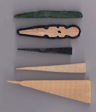 1) mit Filz bezogene Klammerhälfte, 2) zusammengeleimte Klammerhälften, teils mit Filz bezogen, 3) Gummikeil, 4) Filzkeil, 5) Holzkeil – Länge: im Original zwischen 7 und 10 cm, Breite: ca. 1 cm